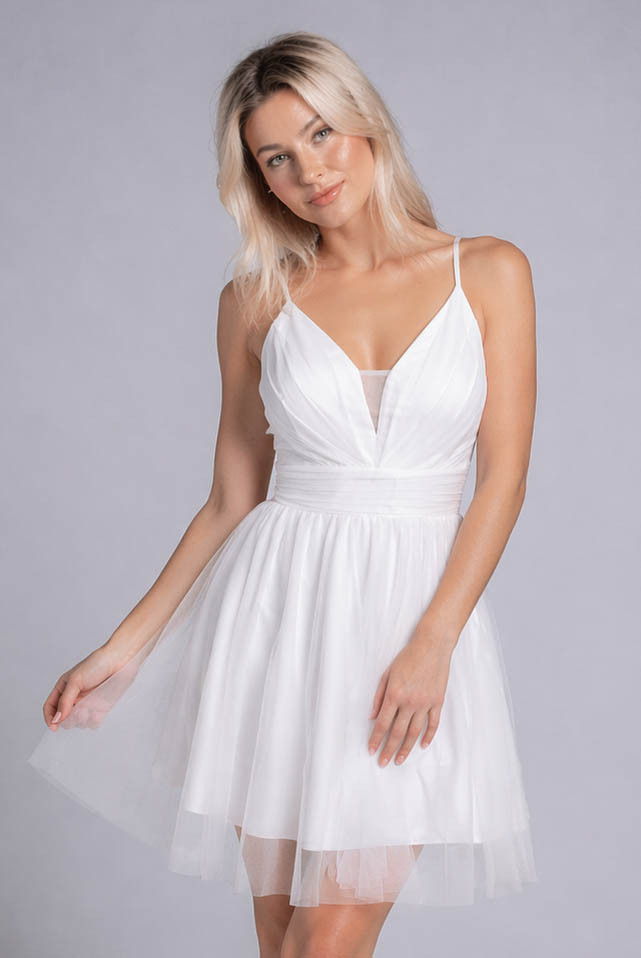 Az Alina fehér, csillámló tüllös rövid menyasszonyi ruha tökéletes választás azoknak a menyasszonyoknak, akik egy letisztult, mégis különleges darabot keresnek polgári szertartásra, tóparti, tengerparti esküvőre vagy egy kötetlenebb, nyári helyszínre.