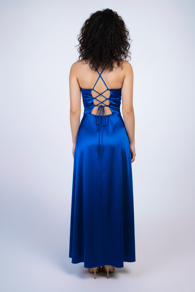 Stella A-vonalú fűzős hátú szatén alkalmi maxi ruha, királykék