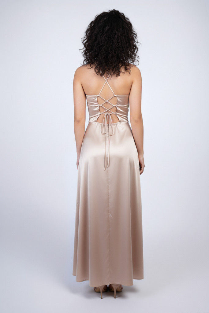 Stella A-vonalú fűzős hátú szatén alkalmi maxi ruha, pezsgő