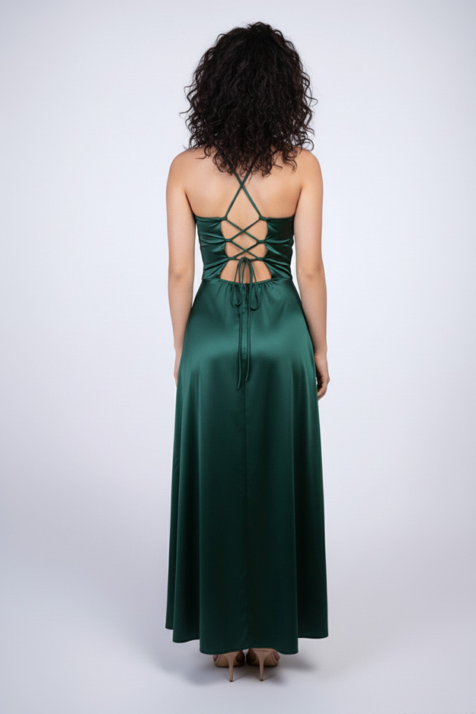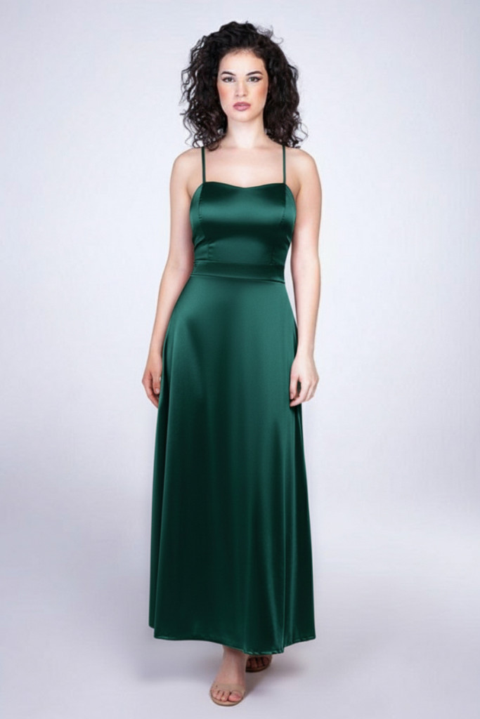 Stella A-vonalú fűzős hátú szatén alkalmi maxi ruha, fenyőzöld