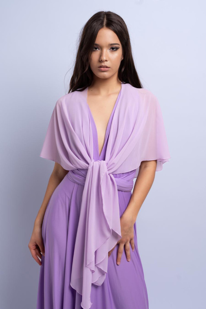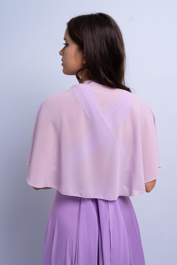 Alkalmi muszlin stóla orgonalila színben. A vállakon lágyan leomolva minden szettet különlegessé és elegánssá tesz.