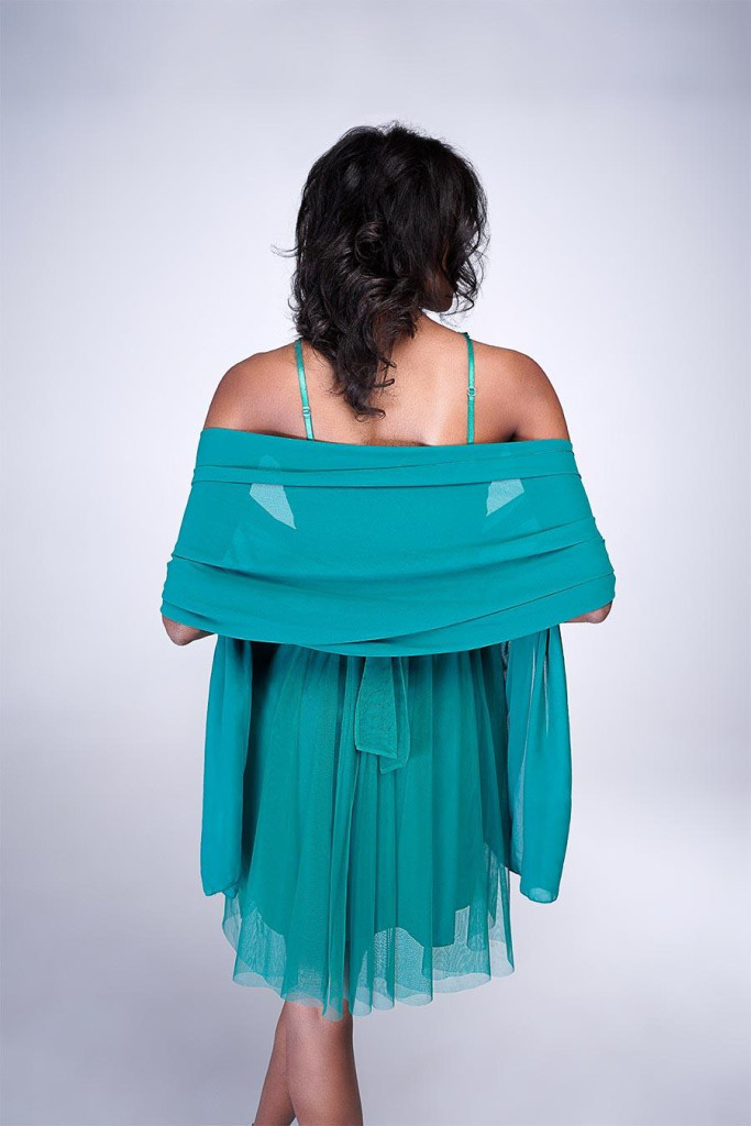 Alkalmi muszlin stóla smaragdzöld színben. A vállakon lágyan leomolva minden szettet különlegessé és elegánssá tesz.