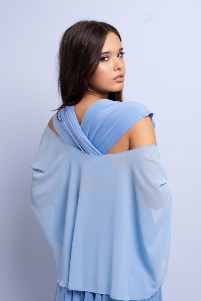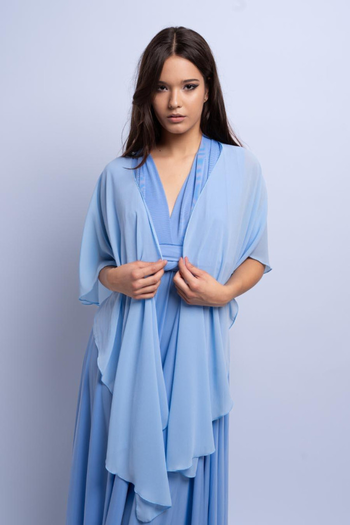 Alkalmi muszlin stóla világoskék színben. A vállakon lágyan leomolva minden szettet különlegessé és elegánssá tesz.